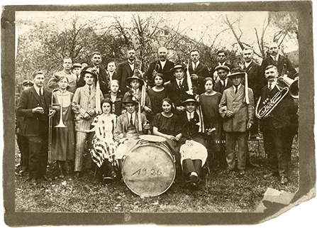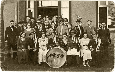 Die Musik vornweg und hinterher liefen die Kirmesburschen mit schönen großen Sträußen am Hut und mit ihren Kirmesmädchen am Arm. Zwei Burschen, die sogenannten Platzburschen, hatten weiße Schürzen vorgebunden, der eine eine Flasche Schnaps und der andere zwei Teller übereinander gelegt zum Einsammeln der Gesundheitsgelder.